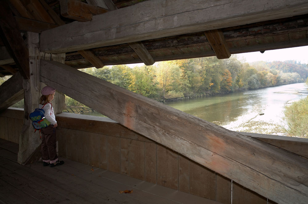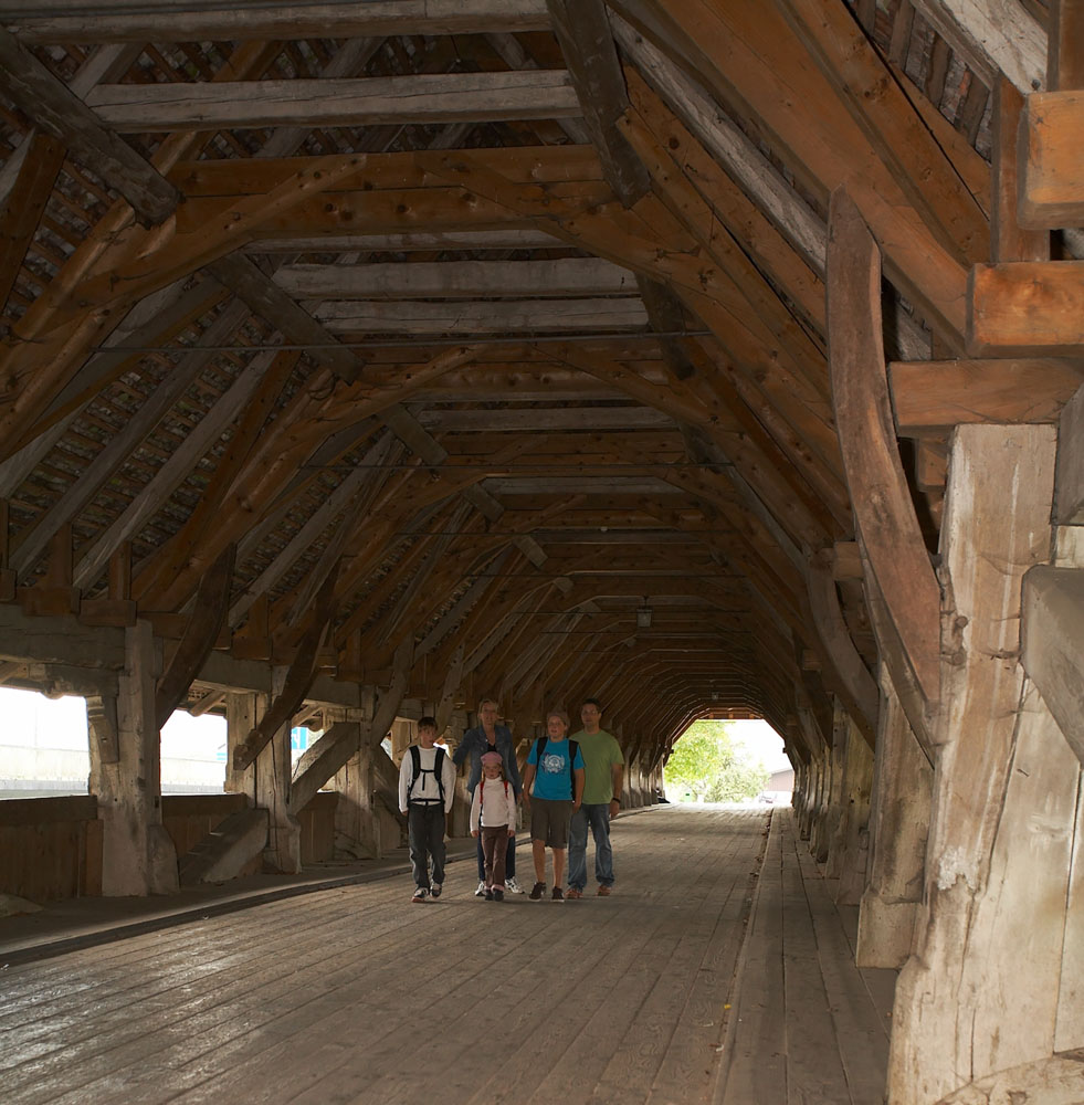 Seit der Erstellung im Jahr 1739 führt die wunderschöne, gedeckte Holzbrücke in Gümmenen Spaziergänger:innen und Velofahrende über die Saane.