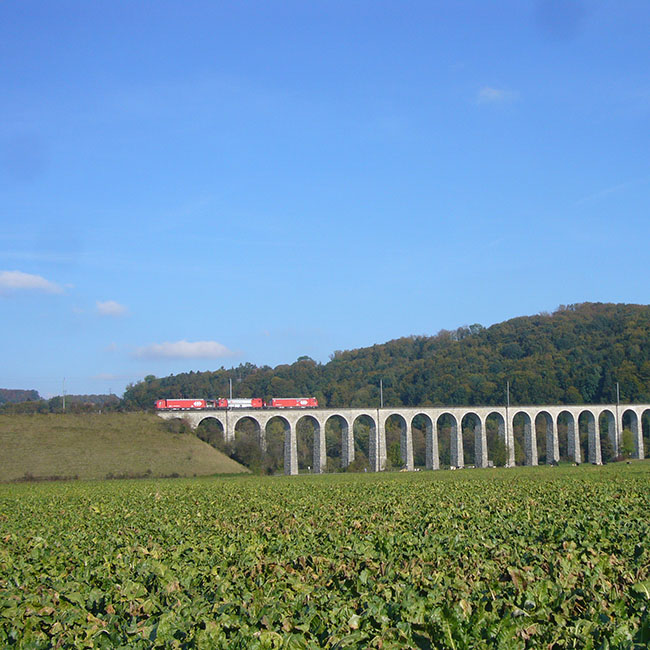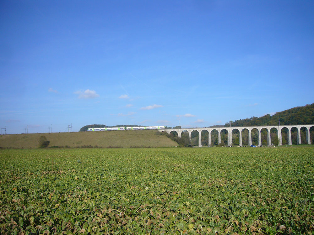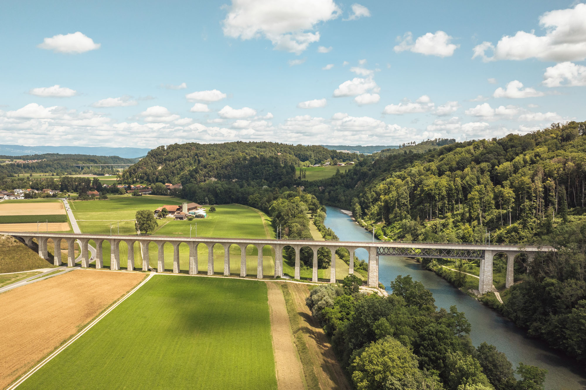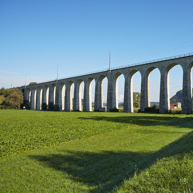 Wuchtig und markant erhebt sich der Bahn-Viadukt in Gümmenen über die Saane-Ebene. Das Bauwerk aus den Jahren 1900 und 1901 stellt die Verbindung zwischen den Berner S-Bahn-Stationen Rosshäusern und Gümmenen sicher, wird aber auch von internationalen Zügen der Linie Bern-Neuenburg-Paris befahren.